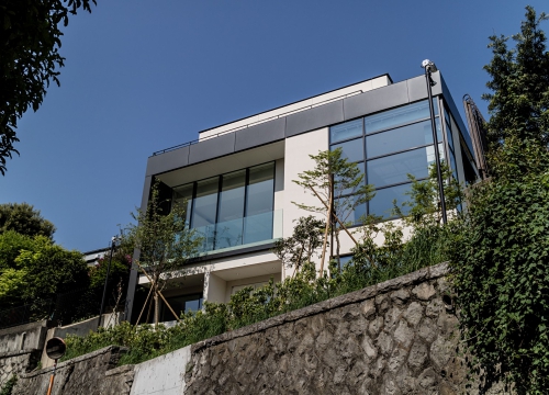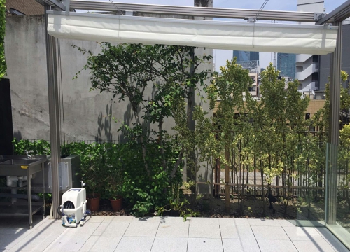 東南アジアの実業家のための東京事務所兼別宅。日本好きのオーナーのためにサクラとモミジを植え、暗闇坂の景観を継承するためボリュームのある緑を配置した。