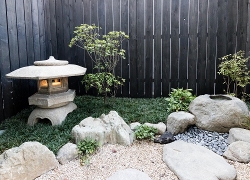 ゲストルームの庭は、近隣から調達した景石と灯篭により和風庭園を作成した。
