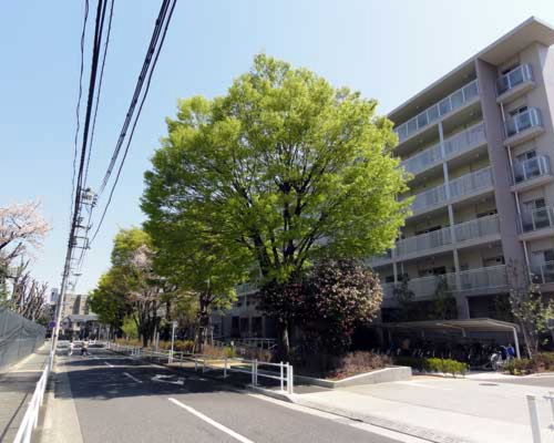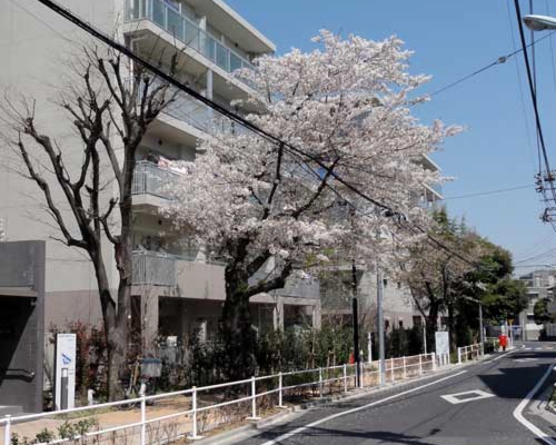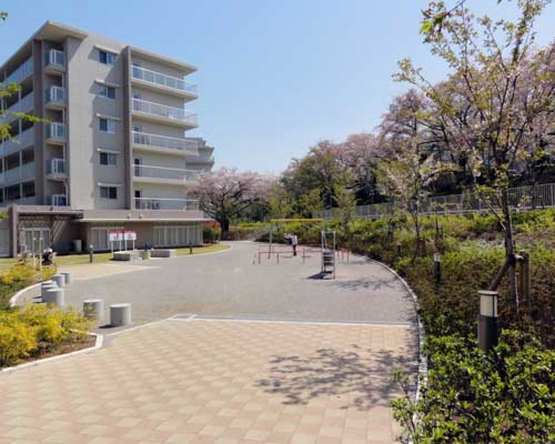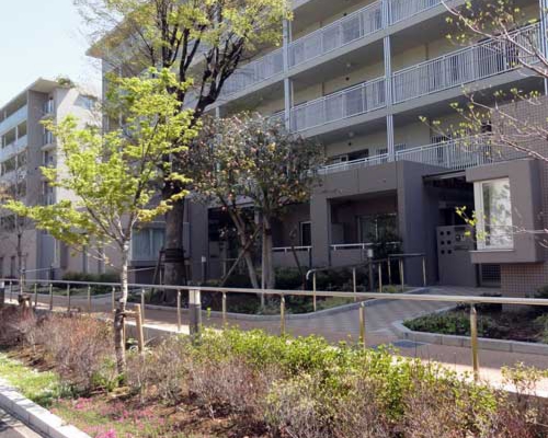 既存樹を保存活用し、住民の拠りどころとなる特徴的な地域景観の継承を図る。住棟のエントランス付近に大径木を配植し、緑陰が感じられる交流スペースを形成。