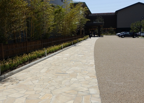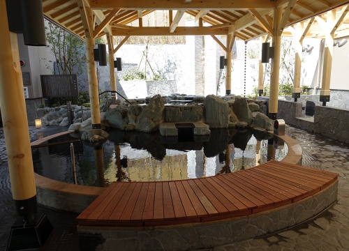 和のテイストを活かしたデザインを展開。沿道植栽からシンボルツリーに向かうアプローチは、駐車スペースと合わせて、おもてなしの空間を演出。露天風呂は心地よい水音を響かせる滝を正面に設え、緑に囲まれて寛げる場を創出した。
