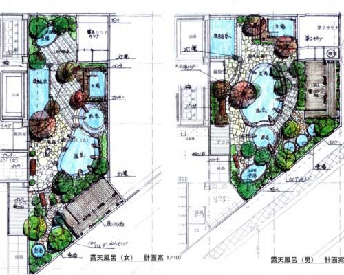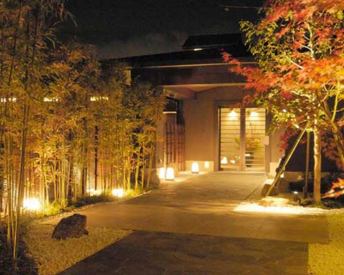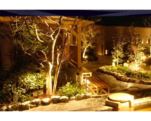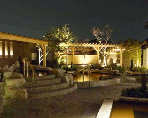 露天風呂、エントランスなどに日本庭園の要素をアレンジしたデザインを展開した。