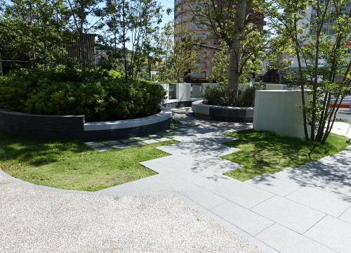住民が主体的にまちづくりに関わり、20年以上の歳月をかけて完成させた市街地再開発事業。敷地の高低差を活かし、新宿御苑に連なる都市スケールの緑から、富久町に暮らす人々が親しんできた軒先や路地の緑まで、多様な緑の記憶を継承する「緑の丘」をコンセプトに空間をデザイン。連続する広場や散策路、小径をたどることで、自然の移ろいや人とのふれあいが安らぎをもたらすランドスケープの創出を目指した。
